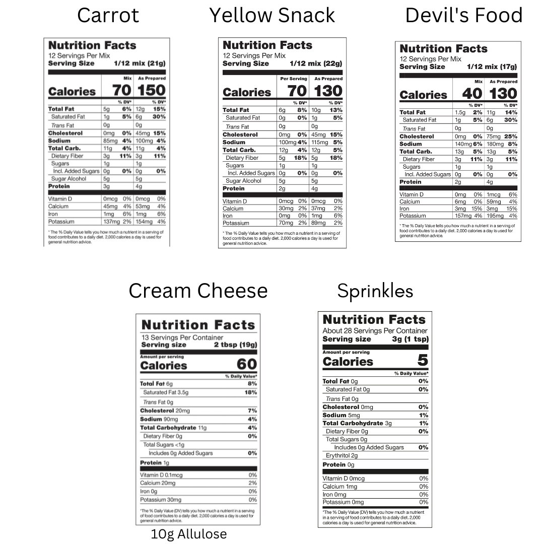 Indulge in a delicious, sugar-free, gluten-free, and keto-friendly baking bundle! Our Cupcake Bundle includes 1 Carrot Cake, 1 Yellow Snack Cake, 1 Devil's Food Cake Mix, 1 Just Add Water Cream Cheese Frosting, and 1 Rainbow Sprinkle to make your sweet tooth happy without sacrificing your health. Enjoy exceptional flavor with no compromise!