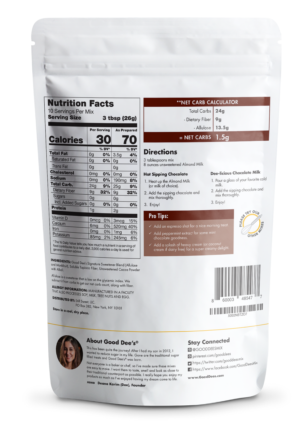 Good Dee's Sipping Chocolate Low Carb Drink Mix - Vegan, No Sugar Added*, Soy Free and Gluten Free